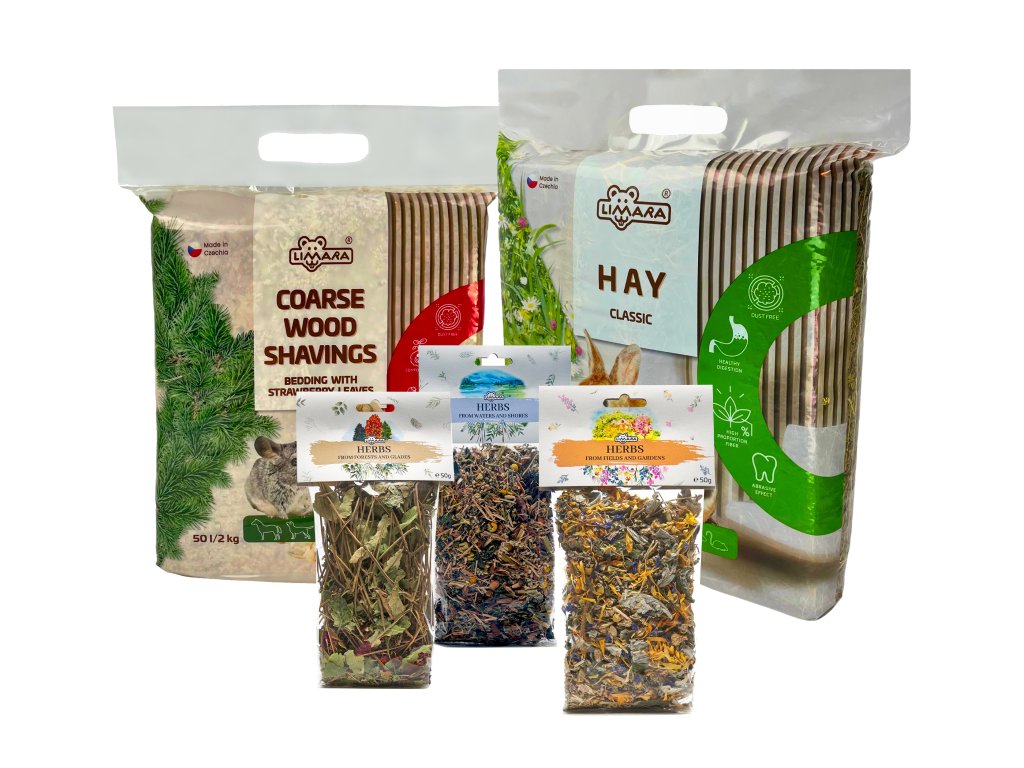 Balíček Péče o mazlíčka PREMIUM je navržen pro ty, kteří chtějí svým mazlíčkům poskytnout to nejlepší. Obsahuje velké balení hoblin s jahodníkem, který je bohatý na vitamíny a podporuje trávení, což přispívá ke zdraví a pohodě vašich zvířat. K tomu dostanete velké balení kvalitního sena pro zdravou stravu a 3x balení výběrových bylinek pro rozmanitost a extra péči. Tento prémiový balíček kombinuje vše potřebné pro maximální komfort a zdraví vašich králíků, morčat, křečků a dalších hlodavců.