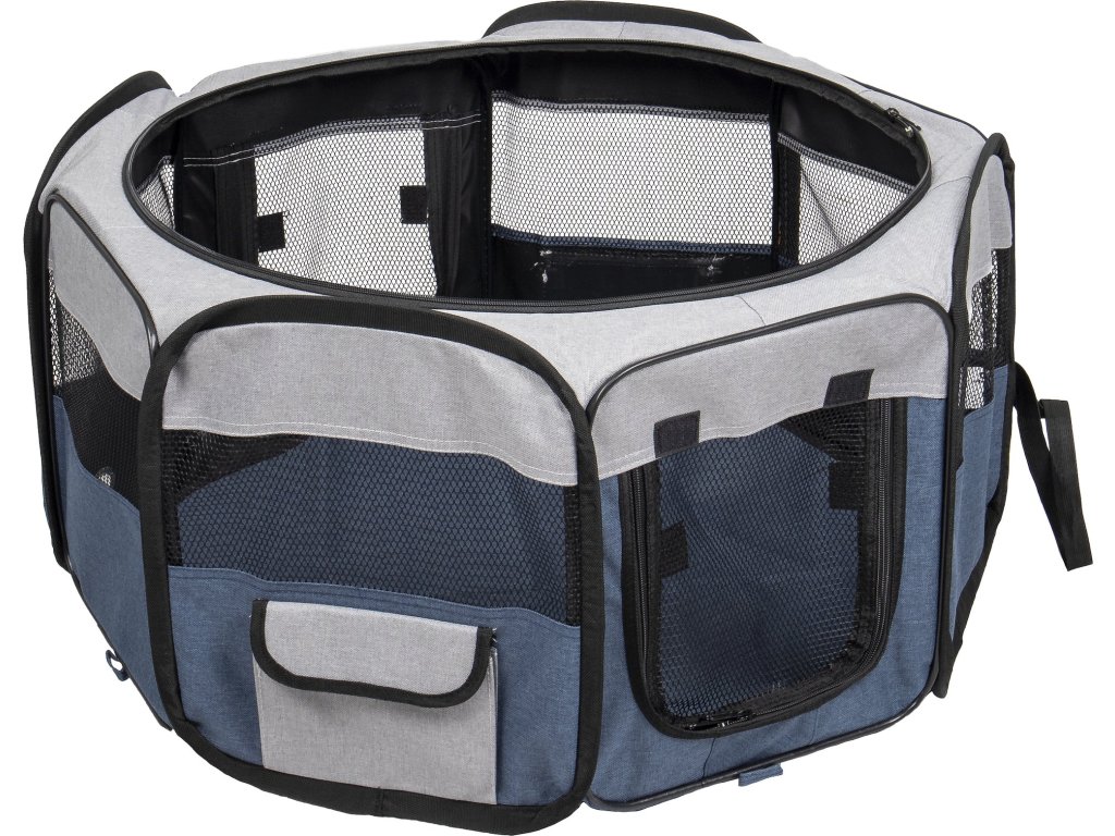 Cestovní ohrádka pro psy je praktická a lehká. Jednoduše se složí do velikosti tašky, a proto si ji můžete vzít všude s sebou. V přední a zadní části je vstupní otvor na zip. Vrchní síťka je odnímatelná. Praktická kapsa na boční straně Vám umožní uschovat potřebné věci.