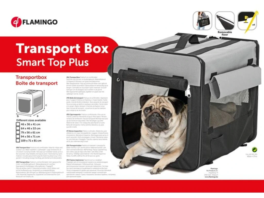 Vezměte svého věrného čtyřnohého přítele kamkoli sebou s pomocí praktické a lehké přepravky Flamingo Smart Top Plus. Díky ventilační síťovině a různým dostupným velikostem je ideální na dovolenou i výlety! Vyrobeno z odolného nylonu s povrchovou úpravou Oxford.
