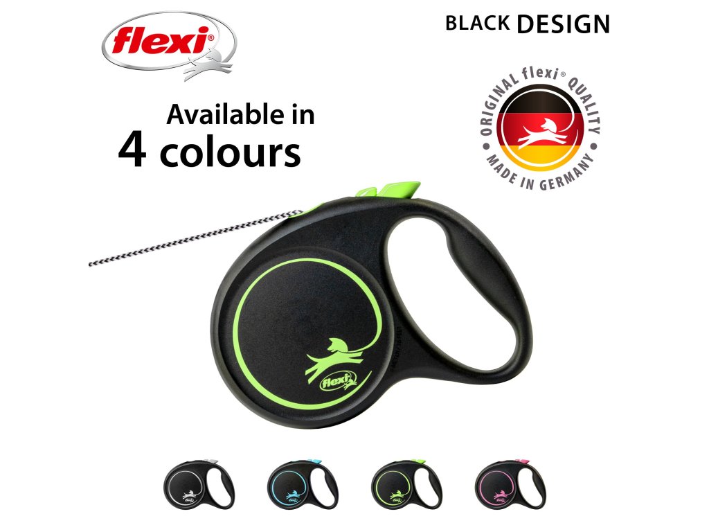 Černá je zpět! Vodítko z řady flexi® Black Design upoutá pozornost na první pohled. Výrazné barvy elegantně kontrastují s černým pouzdrem. Moderní design lze zároveň kombinovat s praktickými doplňky flexi®.