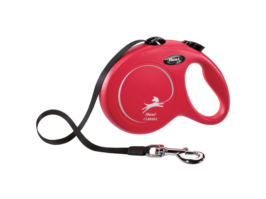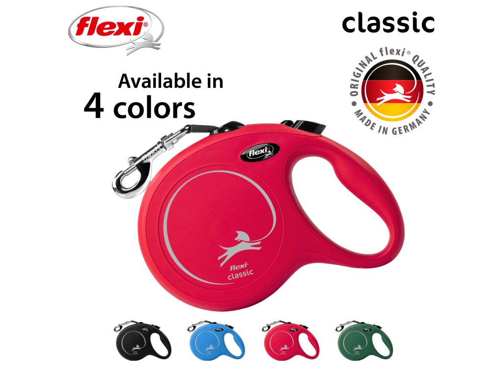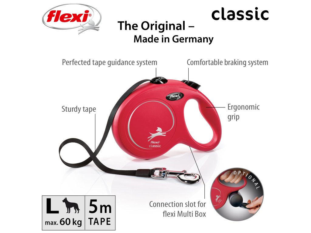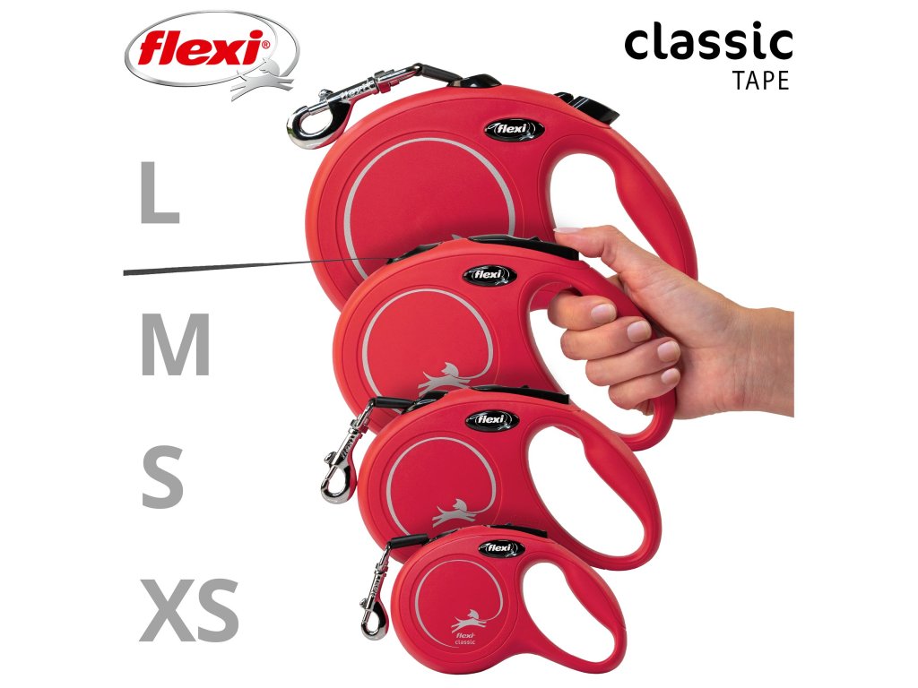 Vodítka flexi® Classic nabízí pohodlný úchop, odolný navíjecí systém i kvalitní, bezpečný a intuitivní brzdový systém, který ve zlomku vteřiny zastaví pohyb psa. Pro snadné upevnění vodítka k obojku nebo postroji je vodítko opatřeno chromovanou karabinou. Samozřejmostí je zdokonalený výstup pásku, který zajišťuje manipulaci v libovolném směru bez zasekávání - potvrzeno nesčetnými testy.