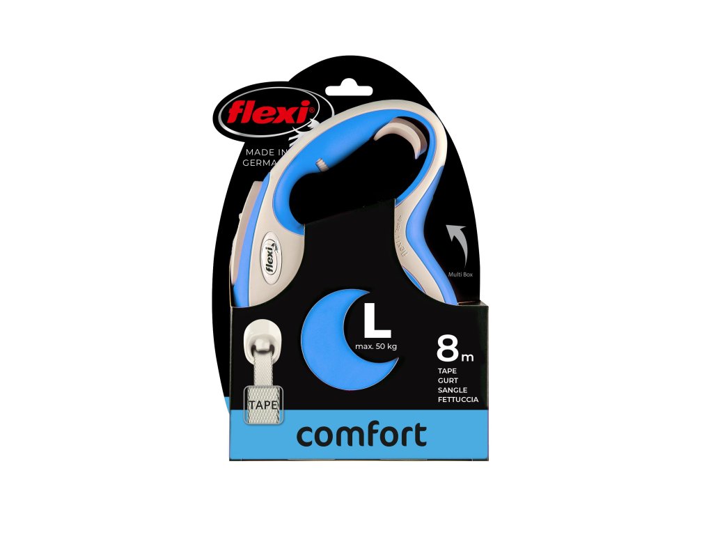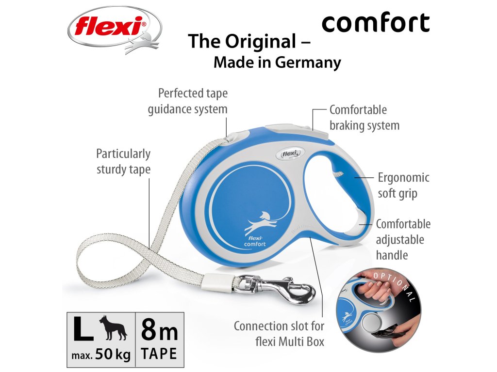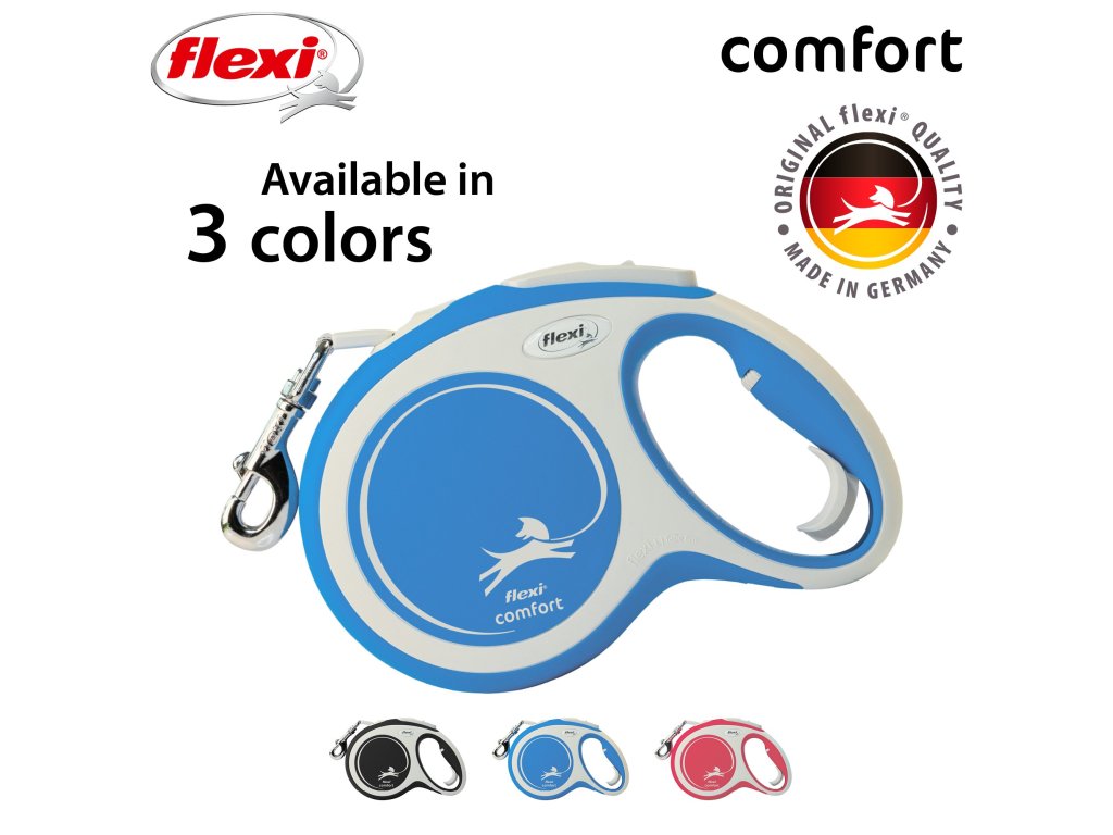 Pohodlné a díky svému dokonale sladěnému designu i unikátní - to je vodítko flexi® Comfort, které nabízí Vašemu čtyřnohému příteli vše, co psi milují: pohyb, pohyb a ještě jednou pohyb! Vás jistě potěší extra pohodlná, měkká rukojeť (ve velikosti M a L je navíc nastavitelná) i zdokonalený výstup a vedení pásku všemi směry bez zasekávání. Na každé procházce oceníte i bezpečný a intuitivní brzdový systém, který ve zlomku vteřiny zastaví pohyb psa. Pro snadné upevnění vodítka k obojku nebo postroji je vodítko opatřeno kvalitní chromovanou karabinou.