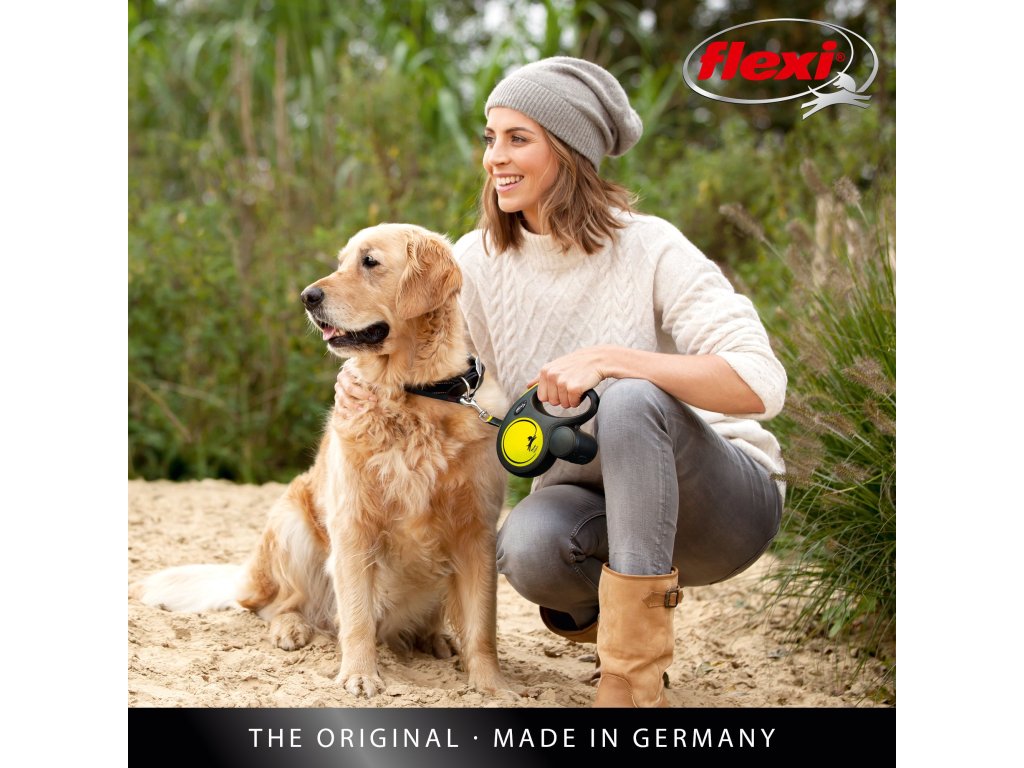 Flexi® Neon zároveň nabízí i nesčetnými testy zdokonalený výstup a vedení pásku všemi směry bez zasekávání. S délkou 5 m poskytuje Vašemu parťákovi potřebnou volnost pohybu.