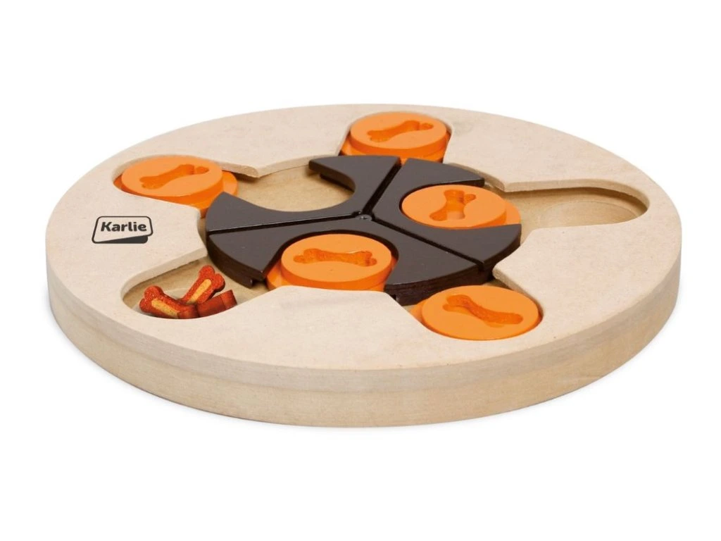 Pro šťastný život psa je kromě fyzické aktivity také důležité pravidelně psa psychicky trénovat. V tomto ohledu poskytují smysluplnou aktivitu hračky pro psy Karlie ze série Doggy Brain Train. Pes hledá svou odměnu otevřením úkrytů posunutím panelů a zvednutím poklopu. Majitelé mohou pomoci a nejdříve psa navést na správnou stopu. Tato intenzivní interakce posiluje pouto mezi lidmi a zvířaty a pomáhá psovi budovat důvěru. Stabilní a kvalitní dřevěná deska je robustní a má průměr 23 cm.