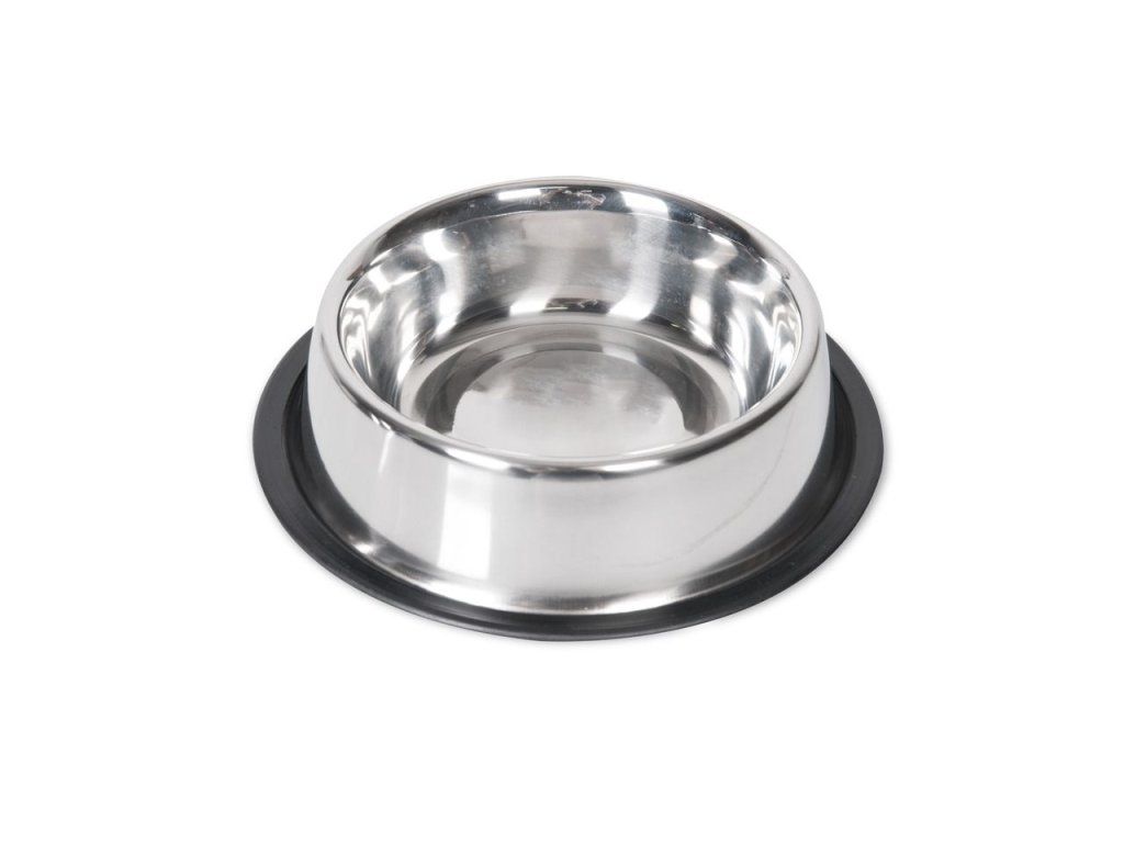 Praktická nerezová miska s gumovým okrajem, která zabrání skluzu po podlaze. Velikost 13cm 450ml.
